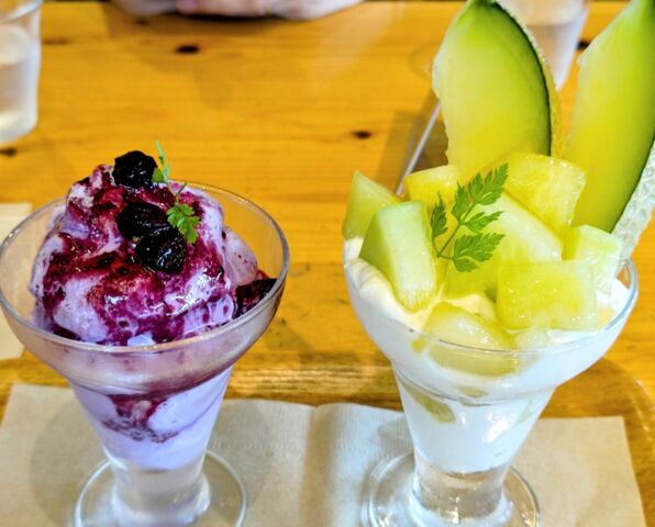 メロンのグラスパフェと塩ブルーベリーシェイク。